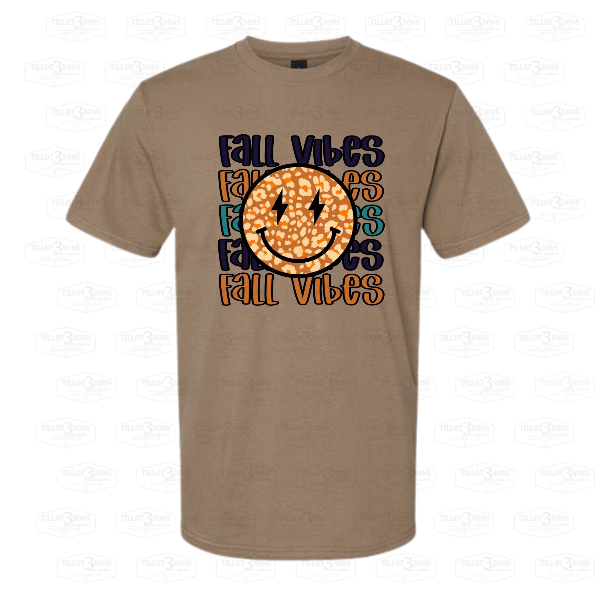The Fall Vibes smiley face design in warm autumn tones makes a great seasonal update to your wardrobe. This graphic is featured on the front of a Gildan Softstyle midweight 65000 short sleeve t-shirt, offering both style and comfort for the fall months.