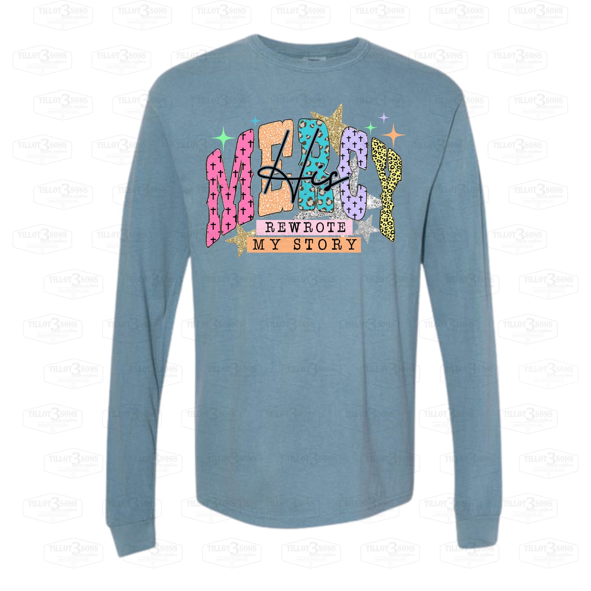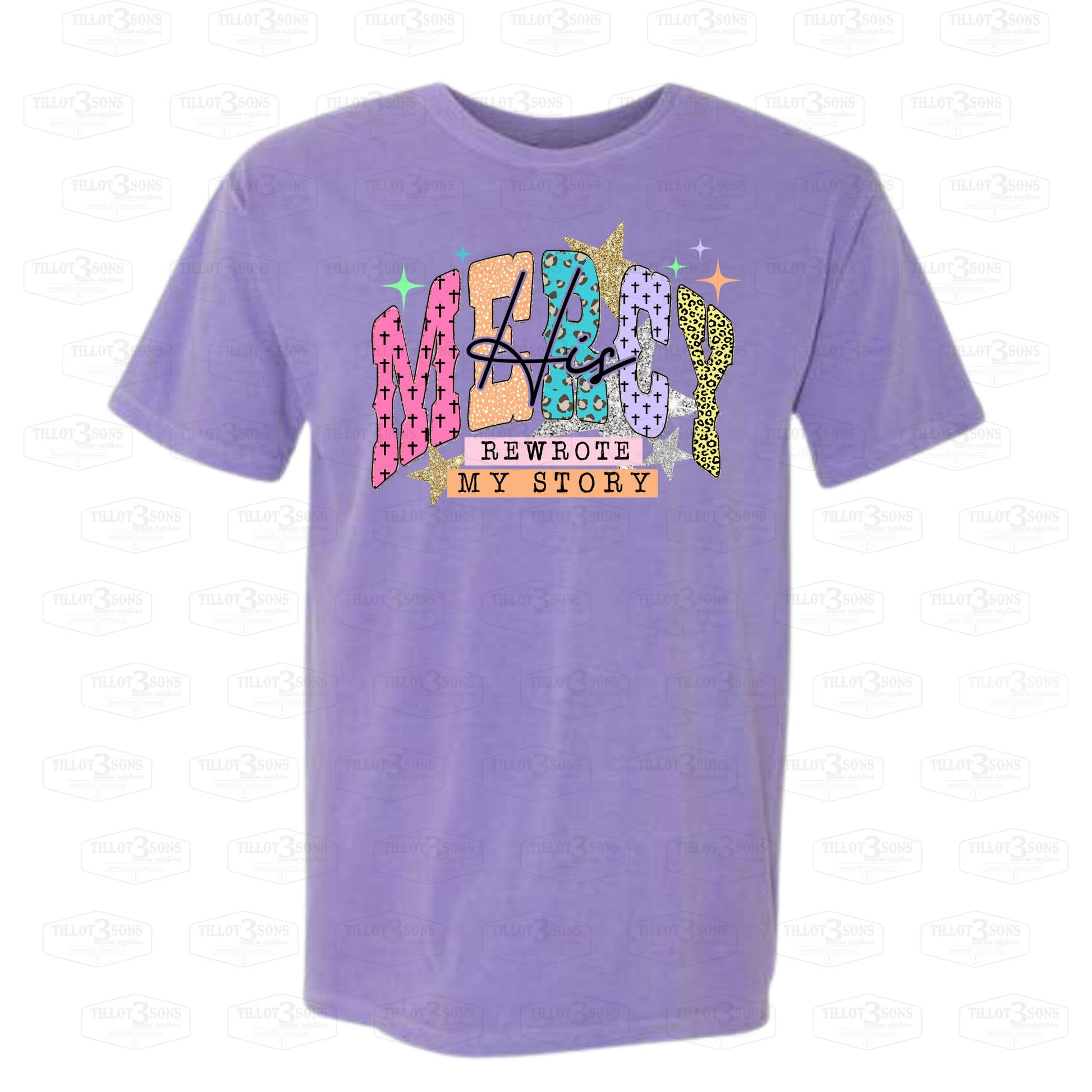 His Mercy Rewrote My Story - this message written in a stylish, preppy graphics makes a statement of His amazing mercy. Available with graphics on the front of a 100% ring spun cotton Garment-dyed Comfort Colors shirt. Comfort and durability - perfect for that lived in feel.