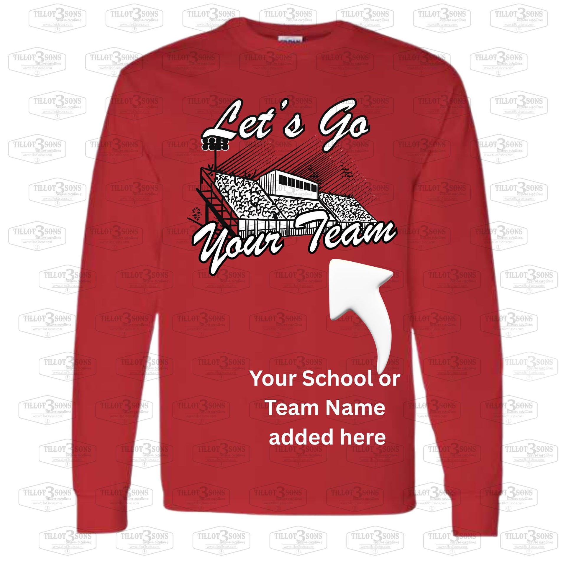 Cheer on your team in style with these fun stadium tees! Featuring "Let's Go" and your team’s name boldly displayed over a stadium drawing. These shirts are ideal for football, soccer, or lacrosse fans. Simply add your team’s name and colors in the customization box to make it truly yours.