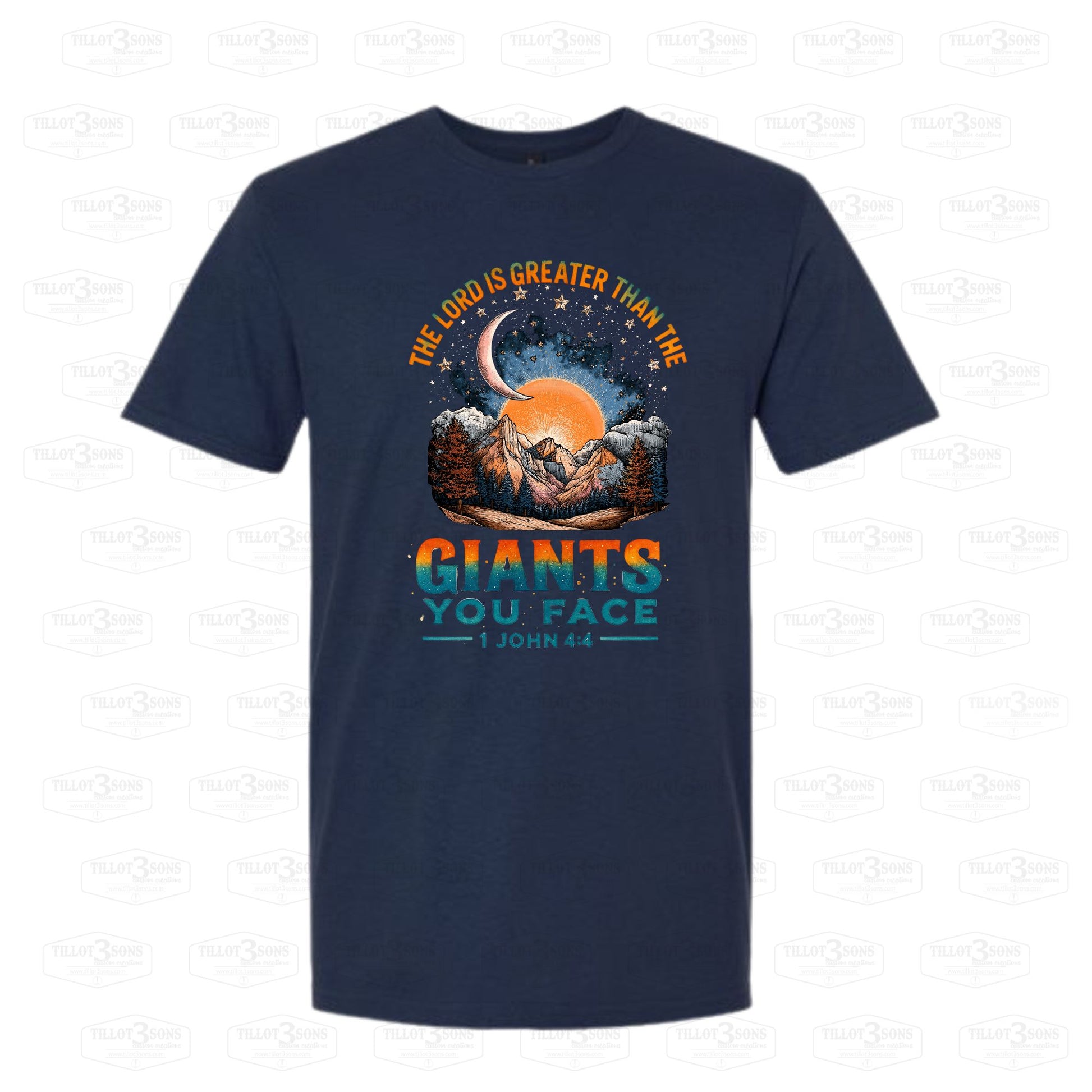 “The Lord Is Greater Than the Giants You Face” – scenic mountain night sky and scripture (1 John 4:4). This graphic is featured on the front of a Gildan Softstyle short sleeve t-shirt, offering both style and comfort for the fall months.